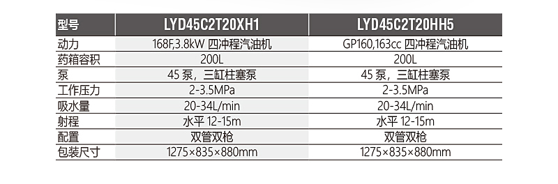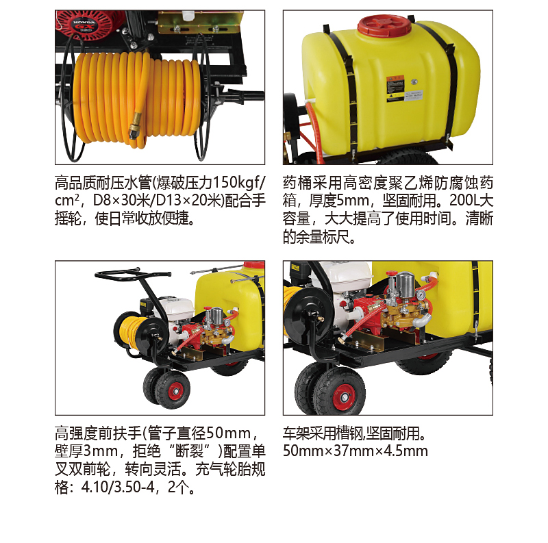 高密度聚乙烯防腐蝕藥箱,藥箱上配有刻度藥量顯示,及時掌握藥液噴灑情況;靈活可轉(zhuǎn)動的前扶手設(shè)計,轉(zhuǎn)向靈活;單叉雙前輪設(shè)計,前輪直徑255mm;雙管雙槍:高壓槍,霧化槍各1套, 高壓水管:D8×30m ,D13×20m