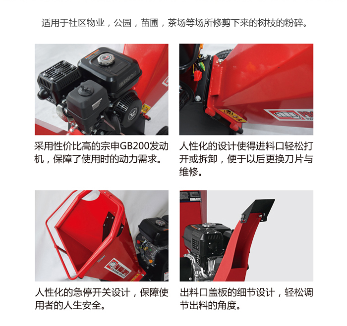 1.整機(jī)小巧靈活,適用于社區(qū)物業(yè)、小型公園、苗圃管理、茶場(chǎng)等綠植的碎枝作業(yè)。